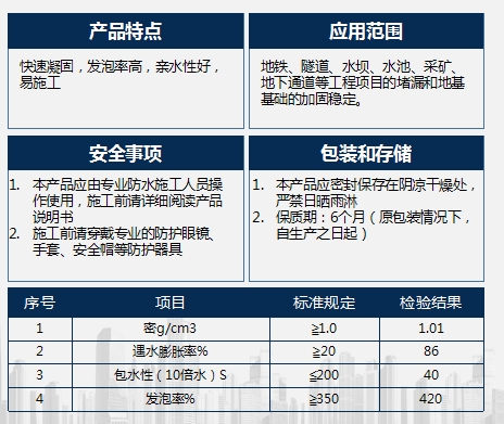 KM-518單組份水溶性聚氨酯灌漿材料是由異氰酸酯和多羥基聚醚等原料經(jīng)過(guò)化學(xué)合成制得的一種高分子快速堵漏材料。該產(chǎn)品遇水后會(huì)迅速反應(yīng)生成一種不透水的乳白色膠狀彈性體,從而對(duì)建筑體的滲漏水部位起到立桿見(jiàn)影的止水目的,是目前最新型的一種防水堵漏材料。
